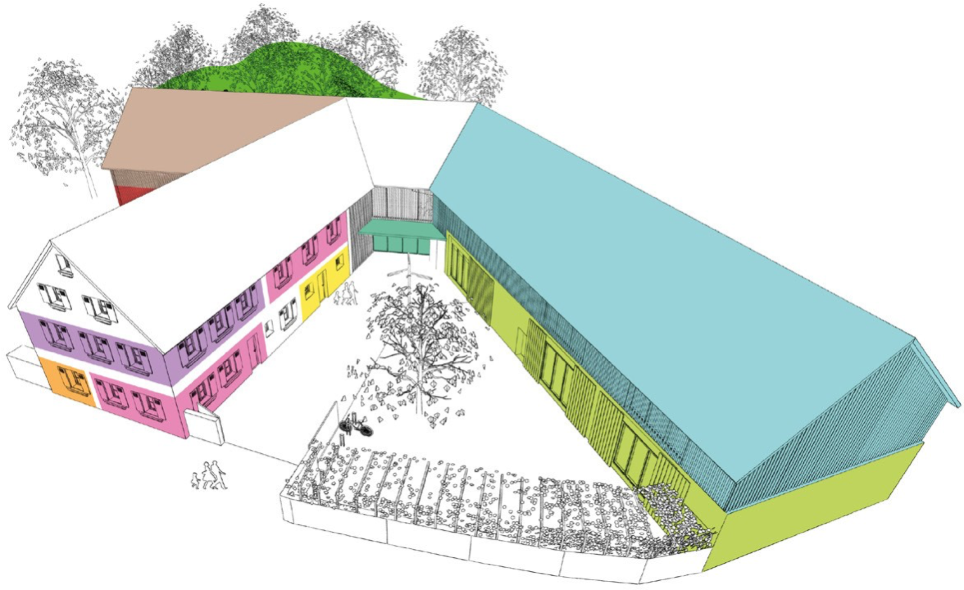 Mit der Umnutzung der Hofstelle Hauptstraße 7 zum Bürgerzentrum und Museum erhält die Ortsmitte von Bubenreuth eine neue kulturelle Adresse. Der öffentliche Fuß- und Radweg wird aufgewertet, Grenzen werden neu definiert und Einblicke ermöglicht. Der Hof als zentrale Eingangsadresse öffnet sich in die Ortsmitte und erweitert damit den öffentlichen Raum. Er lässt sich auf vielfältige Weise nutzen und erfährt seine Belebung aus den ihn umgebenden Nutzungen. Im nördlich angrenzenden Freibereich verstärken neue Baumpflanzungen die historische Struktur des alten Ortsrands; der Neubau öffnet sich mit Bibliothek und Foyer auf eine großzügige Terrasse und den Lesegarten. Klang- und Spielgarten und eine Spiel- und Festwiese ergänzen das Angebot.